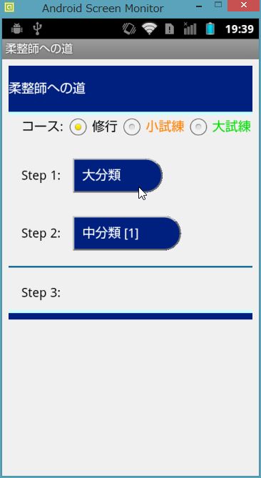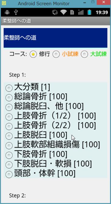 コース: 修行、小試練(小分野の範囲のテスト)、大試練(大分野の範囲のテスト)を選択します。