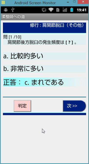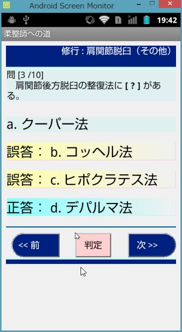 解答選択肢の一つを選択し、 正否を「判定」します。「 次へ>>」: 次の問題へ移ります。
